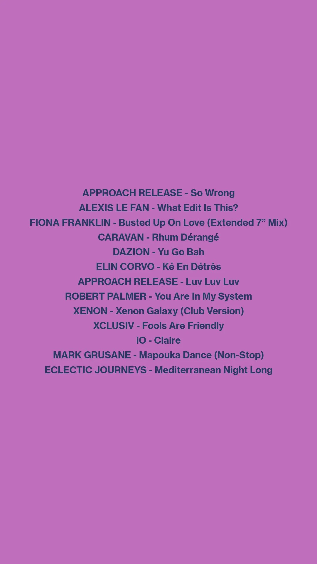 Opening with @approach_release ‘So Wrong’ - maybe my favourite. When the guitar comes in? Get out of here. Pure heartbreak. Left field creepster disco then frankly all over the shop as far as selections go. Something for everyone! Tunes from Caravan off one of our fave labels @planettriprecords , Robert Palmer, @mark_grusane , Fiona Franklin, Dazion… you know the score.